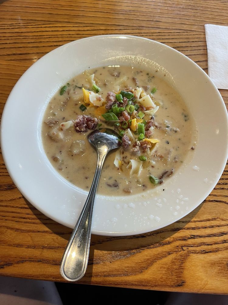 Thick, creamy, and brimming with chunks of potato, this soup is a cozy crowd-pleaser. Topped with bacon, cheese, and green onions, it brings all the flavors of a loaded baked potato into a bowl. It’s a comforting choice for cooler days or anyone craving something hearty without being too heavy. Pair it with a salad or one of their house-made croissants for a satisfying meal.